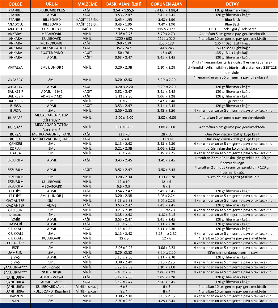Özel bir asım şekli varsa, müşteri bunu sektör sorumlusuna görseliyle birlikte yukarıda belirtilen afiş teslim tarihlerine kadar yazılı olarak açıklamalıdır.